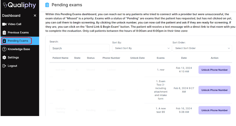- View All Pending and Missed Exams: Quickly identify exams awaiting completion or those missed during patient attempts to connect.