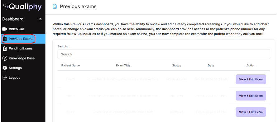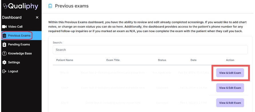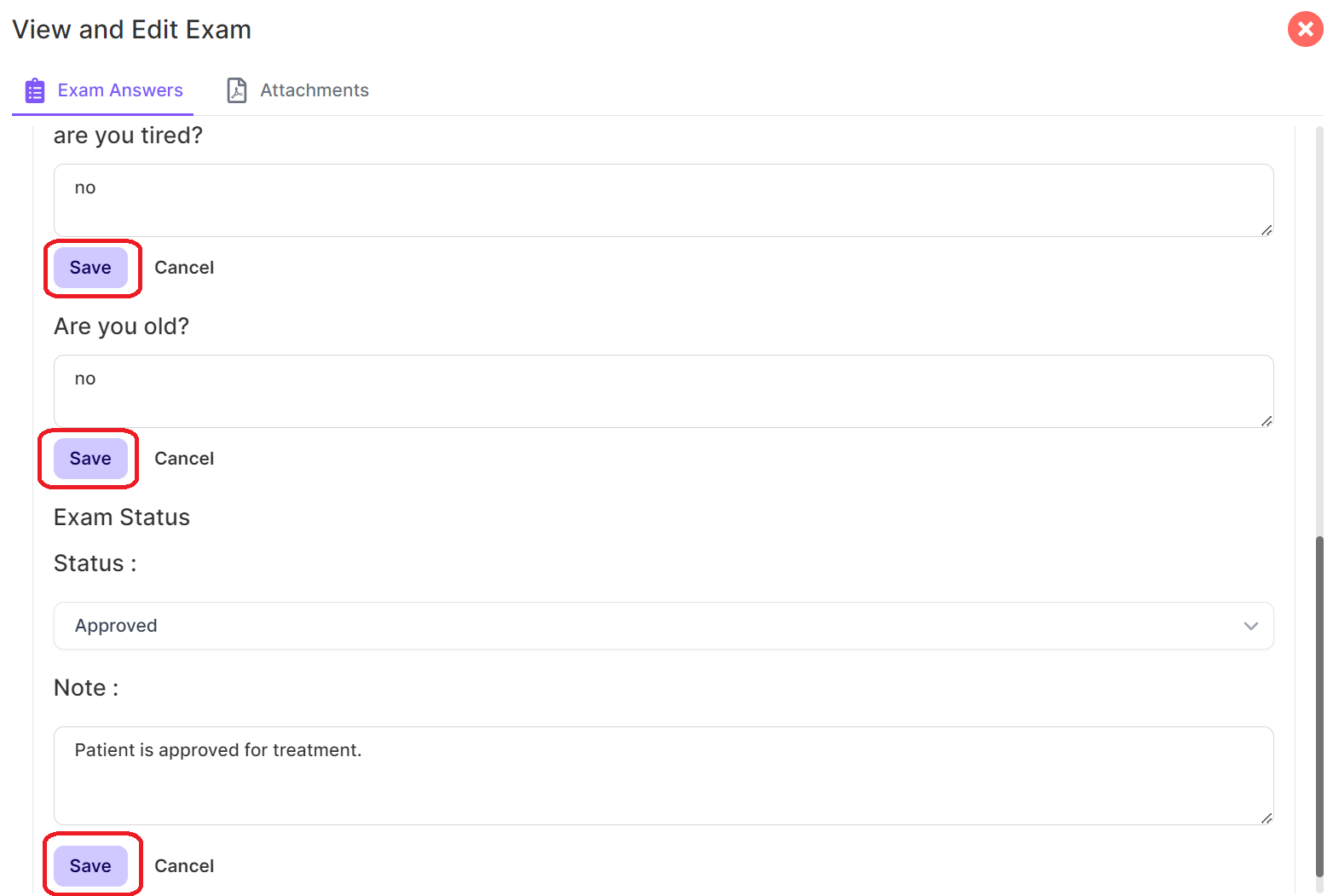 - The exam details will populate, providing you the ability to choose which patient answers to amend. Press “Edit” for any question or “Edit” for the exam status. Make the necessary changes and press “Save” to save your edits.